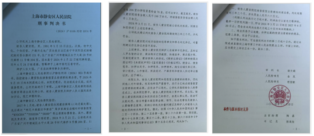 在办公领域,每一个细节都关乎整体效能,而耗材的选择更是重中之重。它不仅直接影响办公效率、左右成本控制,更与使用者的身体健康紧密相连。在打击假冒伪劣产品的征程中,京瓷步履不停,从未有过丝毫懈怠。近期,京瓷打假行动又迎来重大胜利,此前被查处的售假商家已获刑事判决,这一结果既彰显了京瓷打假的坚定决心,也展现了法律的威严力量。