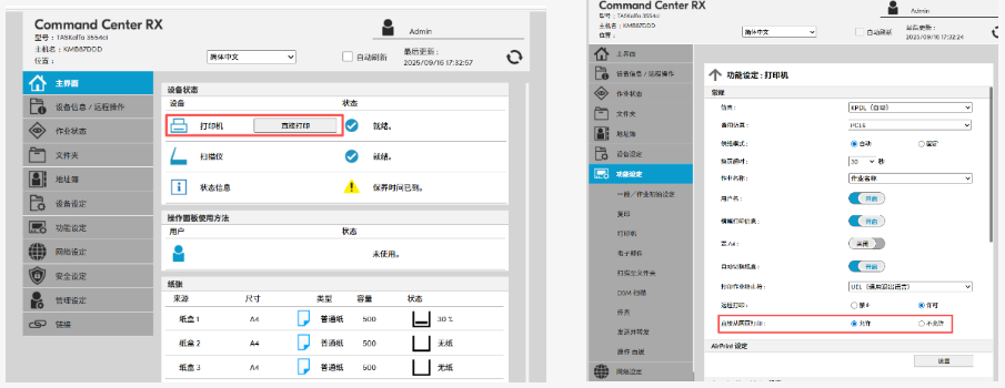 | 打印语言 | PRESCRIBE, PCL6,KPDL3 (兼容Postscript 3), XPS, PDF直接打印版本1.7 & 2.0 |
