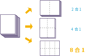 原先的多合一复印功能支持将原稿的2合1以及4合1,新系列新增支持8合1复印功能。用户可以根据自己的需求进行多合一复印,有助于节省纸张与碳粉,减轻环境负担。